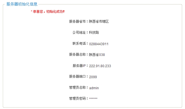 初始化后,进入如下界面,提示“恭喜您,初始化成功”表示该服务器已安装成功(如图19)。