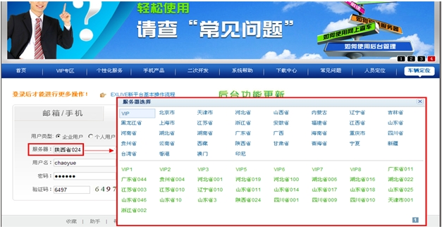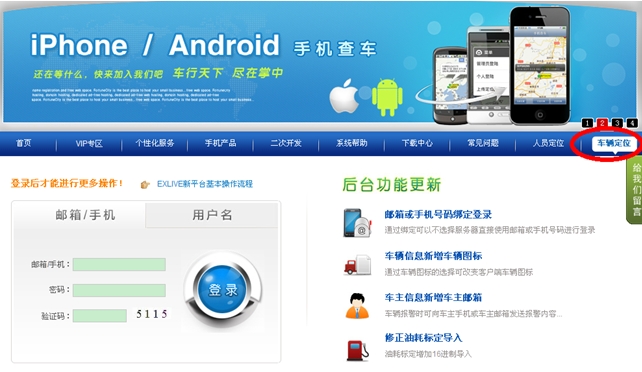 以网站方式登录后台:登录 www.exlive.cn,在首页中导航栏中,选择“车辆定位”,点击进入用户登录界面,选择服务器,输入用户名,密码,点击登录,即可登录新版GPS车辆定位服务平台(如图26、27、28)