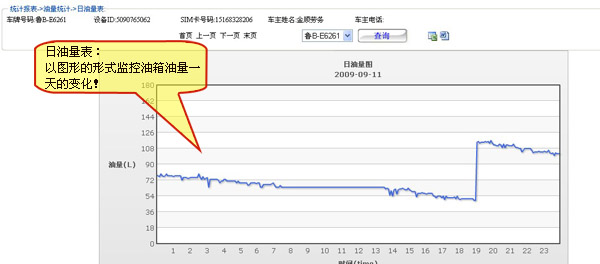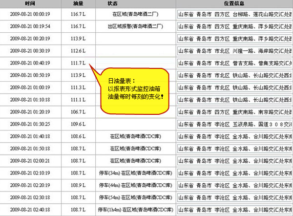 实时监控油箱油量变化,每月加油次数统计、加油量统计、加油时间统计、加油地点统计。漏油时间统计、漏油地点统计,漏油油量统计,杜绝偷油卖油现象发生!