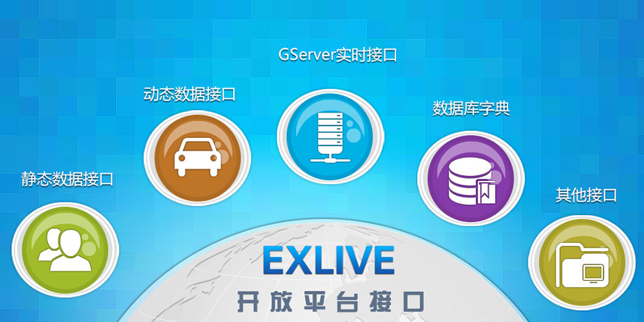 EXLIVE平台致力开放平台建设,提供的接口包含: EXLIVE平台GServer实时接口 - 可以连接GServer服务器程序,获取监控车辆数据,下发实时命令等等; EXLIVE开放平台动态数据接口 - 可以返回车辆当前位置数据、轨迹回放数据等车辆动态信息;EXLIVE开放平台静态数据接口 - 提供增加客户、帐号、分组、车辆等修改静 态数据的接口;EXLIVE平台数据库字典 - 开放对EXLIVE平台后台数据库所有数据表的定义及说明; EXLIVE平台其他接口 - 其他一些面向行业应用的接口。如果我们提供 的接口不能满足你的需要,可以联系技术支持反应,我们将开放更多接口。EXLVIE平台,大家的平台。