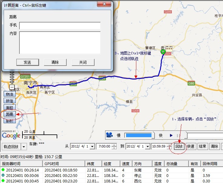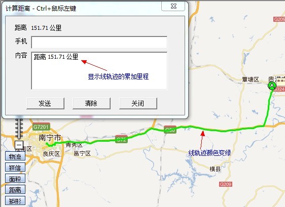 ![]() 针对回放轨迹的里程,有些时候回放的里程是从硬件里取的,有些时候是软件计算的两点之间距离的累加,有的时候由于出现误差,如:软件重复计算、硬件里程被清零,造成里程显示不准,我们可以先“回放”一辆车的轨迹,然后点击google地图左边的“距离”,在地图上Ctrl+鼠标左键点选轨迹。 ![]() |