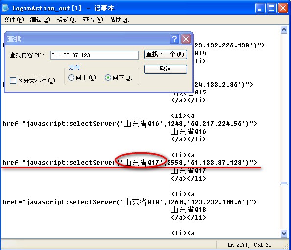 3,在服务器的ip地址,在源文件里搜索,可以搜到服务器名称,如下图,用61.133.87.123搜索,服务器名称为“山东省017”,手机查车服务器选择山东017就可以。如下图
