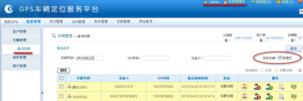 用系统管理员登录后台,查询车辆,给“管理员”前面的框打勾选中,查找车辆,看看能否查询到,如下图:如果还是不能查询到,请联系技术支持查看处理。