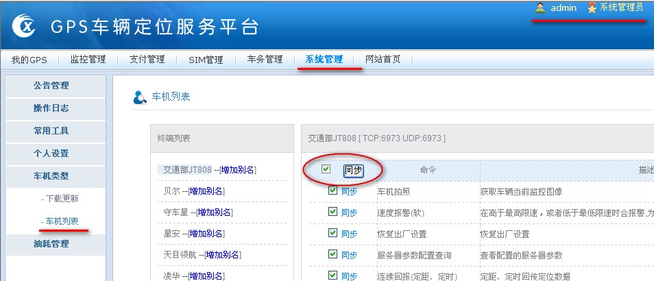 请先用系统管理员帐号登录后台管理,系统管理à车机类型à车机列表,查找到需要的车机进行“同步”车机命令。如下图: