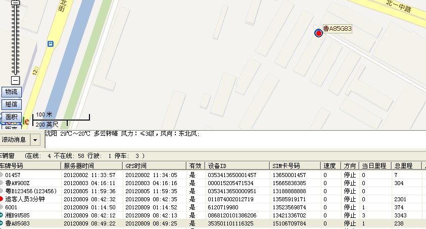 在客户端下方车辆窗双击车辆,地图上就将此车当前的位置图标居中显示。如下图: