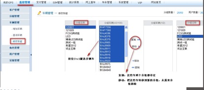 可以 利用后台管理的车辆管理—》修改车组 功能,将一个组的车辆快速复制或移动到另一个分组中去。如下图: