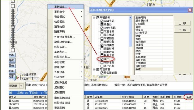打勾选中,然后在车辆列表栏会显示备注信息。如下图显示