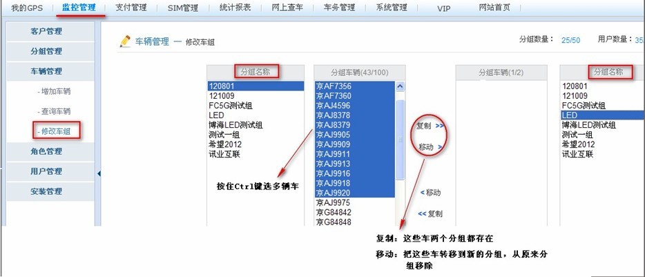 功能,将一个组的车辆快速复制或移动到另一个分组中去。如下图