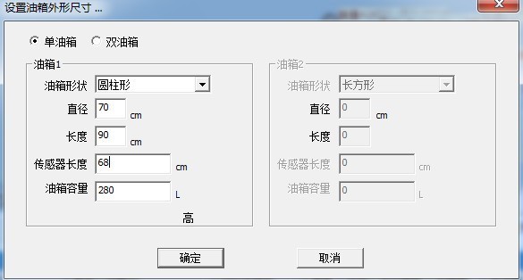 5 圆油箱设置参数为: 其中圆油箱需要输入油箱的直径、油箱的长度(圆柱油箱的高度,一般情况油箱是横着放着)和传感器的长度。容积不用填写。软件可以按油箱的直径、油箱的长度和传感器的长度自动计算油箱里还有多少升油。(定作油量传感器时请按油箱直径减去2厘米)