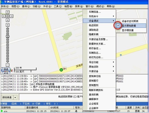 在客户端车辆窗此车辆上点击右键,选择"设备调试"—"显示原始数据",把"显示原始数据"前面的打勾去掉,就可以了。如下图所示:
