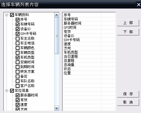 登录客户端,选中车辆后右击 → 点击车辆信息,会出现如下图所示对话框,在想要显示的项目前打勾即可