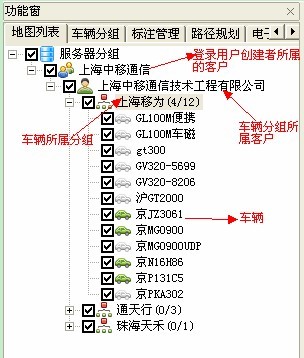 服务器分组是按照用户之前在后台管理中创建的的以分组为单位的车辆以树状的形式显示在分组列表中,并对每个分组当前的车辆在线数动态更新,如图显示