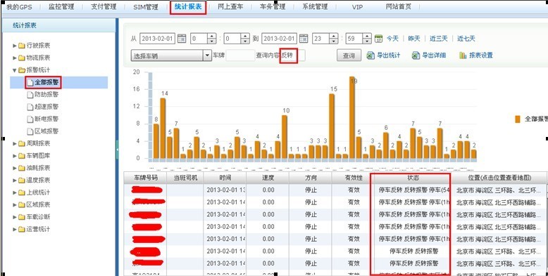 http://60.195.250.102:89/yhbbs/Article.htm?cId=1&fId=8&aId=602 登录后台,打开”统计报表” –”报警统计”-“全部报警”,在查询内容里面输入反转报警即可。如下图所示: