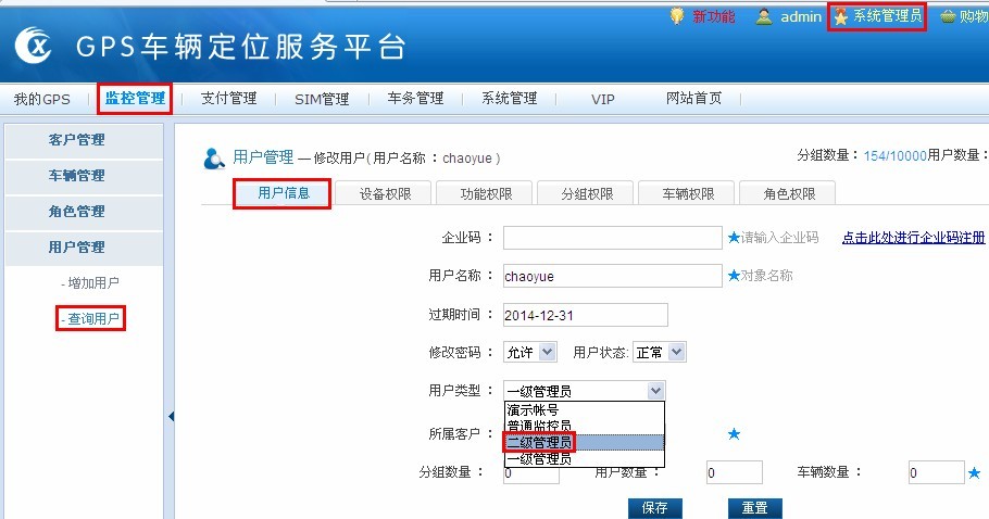 用系统管理员的账号登录后台,“监控管理”-“用户管理”-“查询用户”,修改用户信息,然后将“用户类型”改成二级管理员,然后保存就可以了。