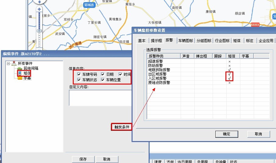 然后登陆客户端,在车辆上右击,选择“编辑事件”-“短信”,选择需要发送的内容,然后点击“触发条件”,在进出区域报警的短信上打钩保存,当这辆车在客户端状态栏显示进区域报警/出区域报警的时候,刚才绑定的手机号码就会收到短信。
