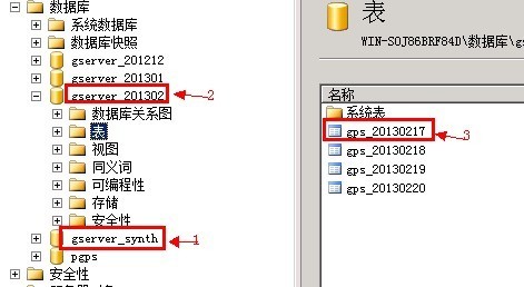 如图 1,表示客户基本资料信息所在库gserver_synth, 2.表示历史数据库记录每辆车子上传服务器的所有数据gserver_201302,历史数据库每月会自动生成一个库,每一个月生成的数据库里每天都会生成一张表,如3表示2013年2月17日的历史轨迹数据库表.这样查找比较方便;历史数据库每月自动生成一个,方便备份。 如何备份数据库请参阅:http://vip4.exlive.cn/synthReports/home/homeAction_gxlbitem.action?updateHistory.id=441
