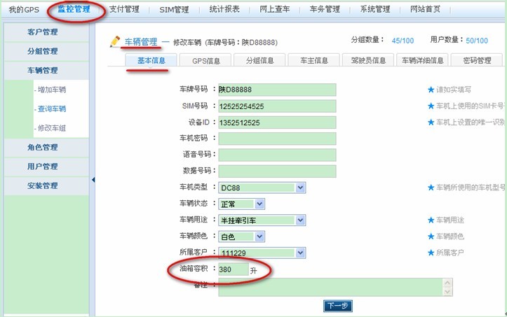 百分比传感器是根据油耗传感器上传的模拟量1和模拟量2的比值,计算油量值,且不用在后台“车辆信息--GPS信息”填写油耗标定。 总油量=油箱容积(后台填写的车辆油箱容积,默认为380升)*(模拟量1/模拟量2)(车机上传的模拟量值)。 设置方法:打开后台“监控管理—车辆管理—基本信息”,填写 油箱容积 即可。 相关附件如下:
