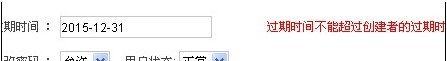 处理方法: 意思就是您要创建的子用户过期时间不能大于他的创建者过期时间 比如,您登录的管理员帐号过期时间是2014年12月31日过期,那么他创建的子用户过期时间如果选择2015年12月31日,就会提示这个,只有你的时间小于2014年12月31日 或是,给你的创建者用户延迟时间到2016年,你的子帐号才可以添加2015年成功。