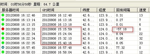 这个 应该是设备 中途掉线 不定位造成,,如下图:设备在16:22补发了一条15:15的时候的定位数据。平台轨迹回放时,如果在“设置”面板里选择按照“接收时间”排序,“回传间隔”列就是负数。