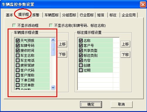 刷新一次地图或者断开重新登录一次客户端是可以根据设置内容自动设置大小的。 客户端地图上车辆显示的浮动窗内容从这里设置 客户端--系统设置--车辆监控参数设置--提示框 相关附件如下: