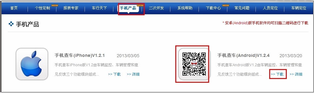 > 手机产品中,可以使用二维码下载 安卓手机查车安装并体验