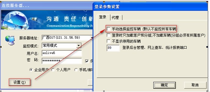 1),查看客户端登录“设置”是否给手动选择监控车辆打勾,如果打勾了,请去掉。