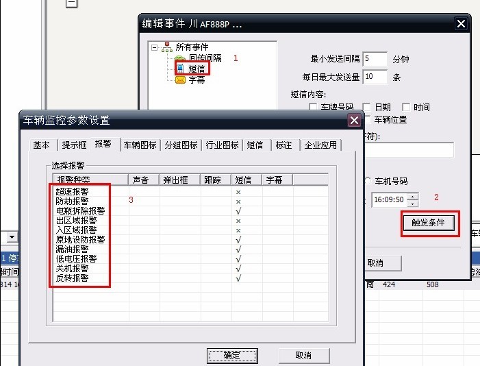 可以,平台在车辆窗 右键 编辑事件—>短信—>触发条件—>目前我们平台支持10中触发报警发短信的 报警类型,如 超速报警,防劫报警,电瓶拆除报警,出区域报警,入区域报警,原地设防报警,漏油报警,低电压报警,关机报警,反转报警 步骤如图
