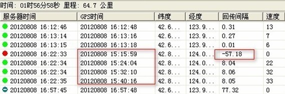 这个可能是设备 中途掉线或者gsm信号不稳定,没有及时将数据发给服务器端造成,如下图:设备在16:22补发了一条15:15的时候的定位数据。平台轨迹回放时,如果在“设置”面板里选择按照“接收时间”排序,“回传间隔”列就是负数。