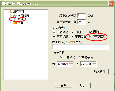 右击设备“编辑事件”短信 给车辆速度打钩即可,如下图: