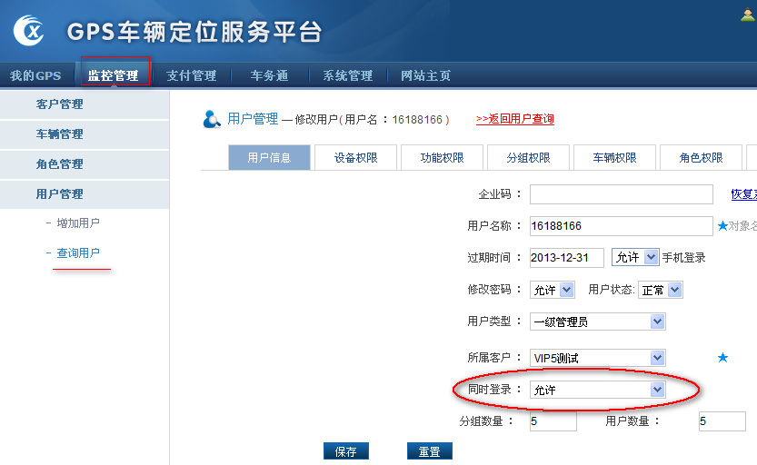 (2)、后台管理再增加其他的用户名,所属分组(或者车辆权限)选择相同的车就可以了。然后多用户登录系统。