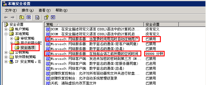 开始-->运行-->tscc.msc 连接-->RDP-Tcp右键属性-->会话 把这里面的替代用户设置的设置都改为从不,并且把从不勾选。 需要说明的是:前述工作做完后,本人的远程服务器还是问题依旧,接下来: 取消开机按ctl+alt+del,这一点大家都会吧。 开始-->所有程序--> 管理工具-->本地安全策略-->本地策略-->安全选项:microsoft网络服务器:当登录时间用完后自动注销用户,改为“已禁用”。microsoft网络服务器:在挂起会话之前所需的空闲时间,改为99999,实际上是禁止了此策略。