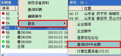 1.查询SIM卡余额 “查询SIM卡余额”功能目前可查询的SIM卡只支持山东卡,其他省份将陆续接入; 具体操作步骤如下: 登录客户端,在车辆窗选中要查询的车辆右键,在菜单中选择“服务”,选择“查询SIM卡余额”,如图1