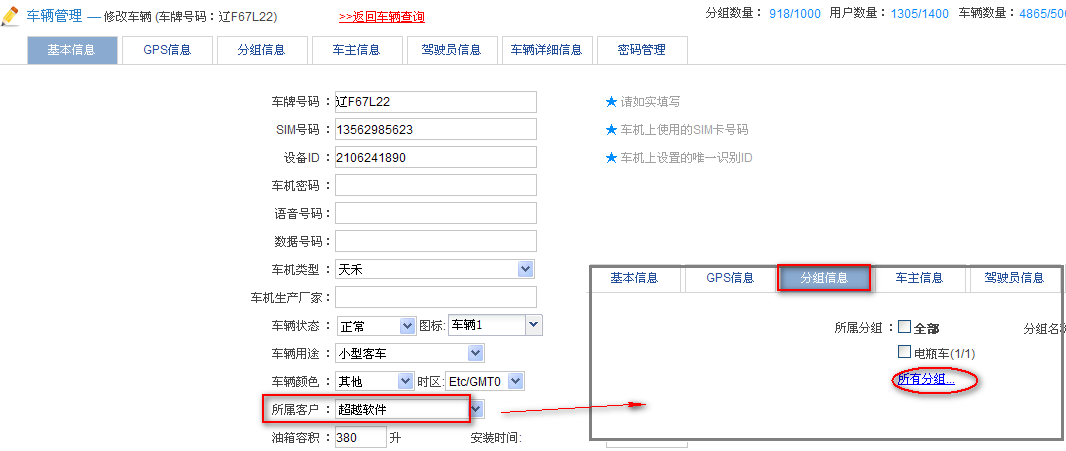 由于有些管理员创建了很多分组,导致在增加车辆选择所属分组的时候,有很多的分组排列,不方便选择。现在平台优化为:增加车辆在【基本信息】中选择了“所属客户”,那么【分组信息】模块默认只罗列和此客户绑定的分组名称,便于客户查找。如果客户需要看到其他的分组名称,点击【分组信息】中的“所有分组”按钮,就可以看到这个管理员下所有的分组名称(不区分哪个客户,罗列创建的所有分组名称)。