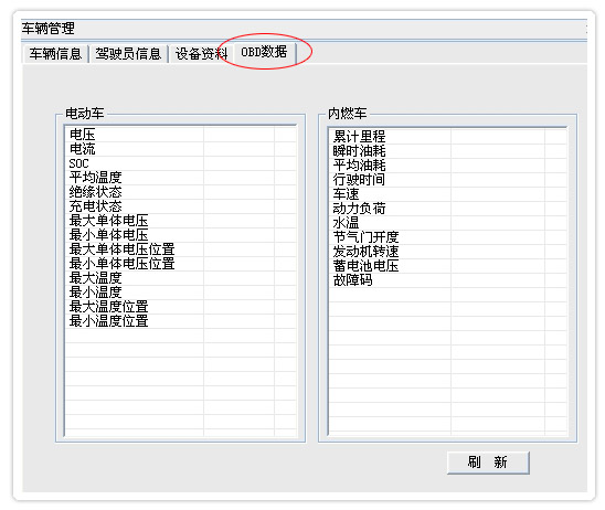 1.客户端车辆信息框中增加OBD数据显示,可对车辆进行远程诊断,显示车辆的累计里程、瞬时油耗、平均油耗、行驶时间、车速、动力负荷、水温、节气门开度、发动机转速、蓄电池电压、故障码等信息