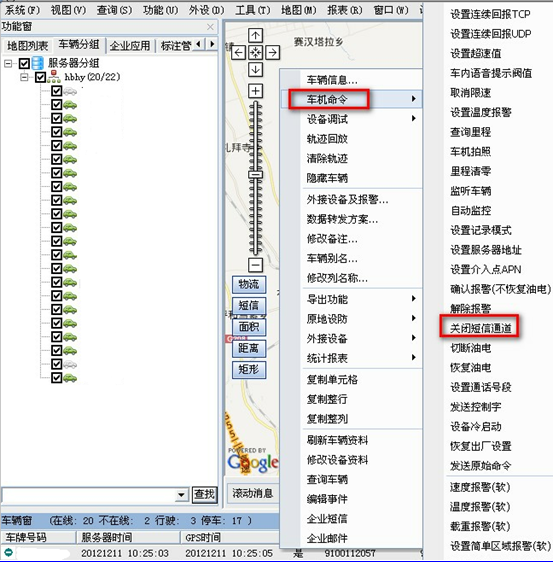 在车辆上右击,下发 “车机命令”-“关闭短信通道”命令即可。如下图所示: