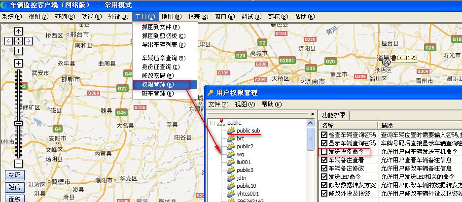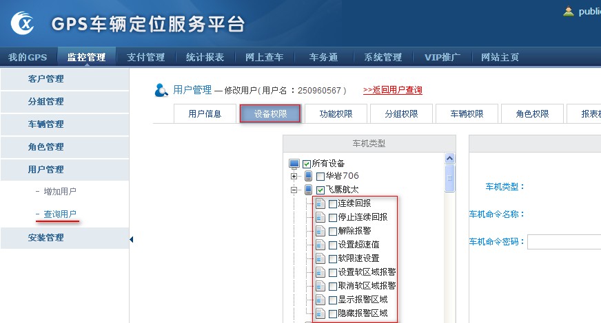 1.从后台管理,对单个用户启用命令管理 增加/修改用户时,在设备权限哪里,不要给此设备的命令打钩,这样该用户就不能发送车机命令了 ![]() 2.从服务器上对所有的用户发送设备命令启用权限管理 如果是自检服务器,登录到服务器上,在gserver程序“系统”--》选项中,给“启用客户权限管理:打钩 ![]() 然后登录到客户端上,在“工具”》“权限管理”对话框,选中用户,只有勾选了“发送设备命令”,的用户名才能登录客户端发送设备命令 ![]() |