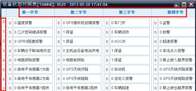 在车辆中通过双击选择一辆车,然后选择“设备调试”功能的“设备状态对照表”项,将显示如下图的界面。(注:红色数字代表设备当前状态值,后面的黑色数字及文字表示设备的有效值及功能说明)对照车机上传的数据字节跟位数