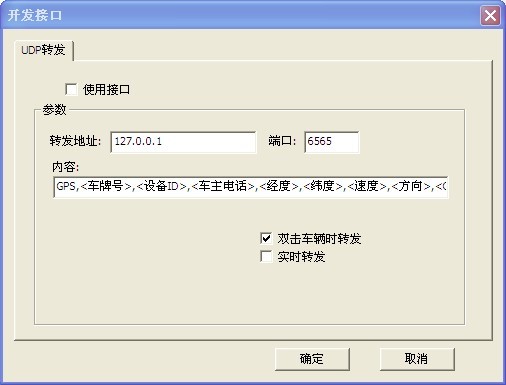 在“使用接口”前打勾,输入要转发的IP和端口号,选择“双击车辆转发”或是“实时转发”,这时所转发服务器的IP和端口就会收到以下信息,“GPS,<车牌号>,<设备ID>,<车主电话>,<经度>,<纬度>,<速度>,<方向>,<GPS时间>,<接收时间>” |