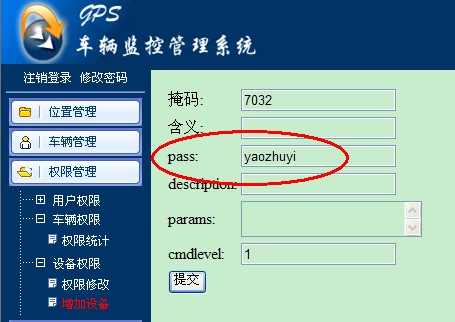 系统管理员在后台“设备管理-->设备权限-->增加设备”添加车机及命令时,可添加车机命令密码。