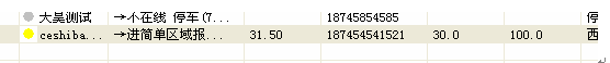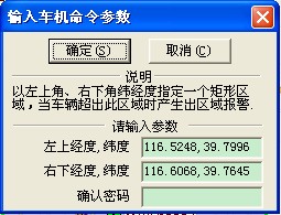 设置"简单区域报警",不需要FServer,实现一个矩形简单电子围栏,设置进/出区域报警; 1.在客户端车辆窗,选择一辆车,点击 矩形 操作按钮,画矩形范围,如下图: 点击 确定,显示区域的经纬度范围;