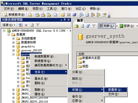 在数据库gserver(新系统为gserver_syhth)上点击右键,选择“任务-à收缩à数据库”