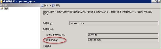 ? 查看数据库当前可用空间 (GSERVER一般在可用空间低于3%时给予提示“数据库可用空间不足”) 注意:在”收缩数据库”页面查看完可用空间后,点击页面右上角的”x”号关掉页面即可,不要点击下方的”确定”按钮,否则数据库又收缩到了原来的大小。