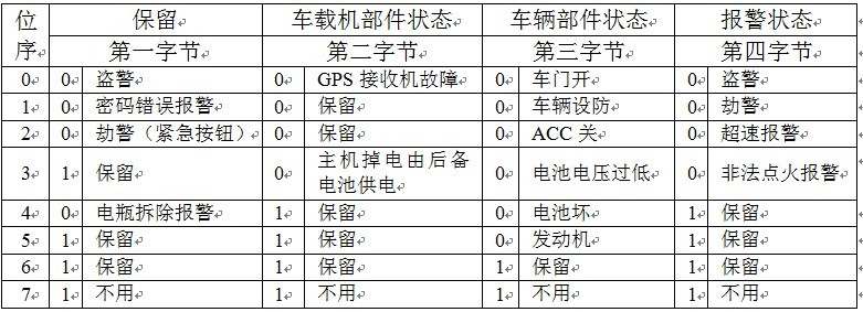 vehicle_status:车辆状态,共四字节,表示车载机部件状态、车辆部件状态以及报警状态等。用ASCII字符表示16进制值,下面是该变量中各字节的每一位的具体含义,bit表示采用负逻辑,即bit=0有效。如下表所示: