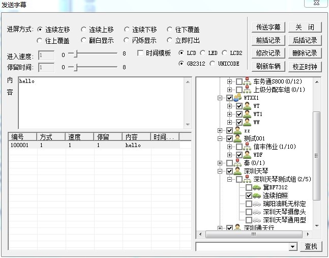 在内容中输入要发送的信息,然后点击"前插记录"或"后插记录",然后选下面的信息及右面的车辆,最后点击"传送字幕"。