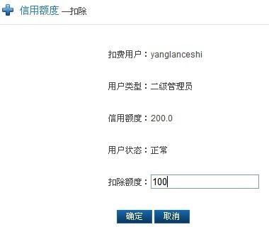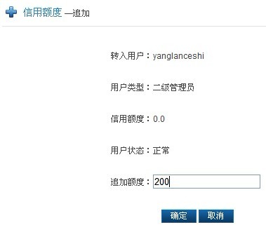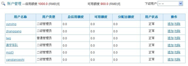 (注:信用额度是指用户透支的最大资金、可用额度是指现在还能透支的最大资金,追加是指增加用户的信用额度、扣除是指从用户信用额度里减去信用额度)