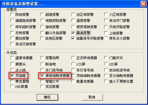 双油箱的车在客户端“外设及报警设置”给“双油箱”和“单线油耗传感器