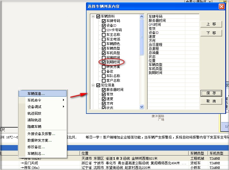 1,车辆列表栏点击右键,选择“车辆信息”,给“到期时间”打勾选中,如下图: