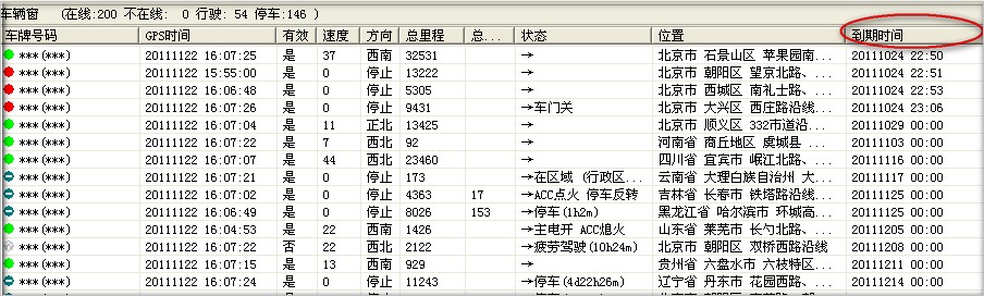 2,在车辆列表栏“到期时间”列就可以看到车辆的过期时间,点击列名称“到期时间”,还可以按照到期时间排序,如下图:
