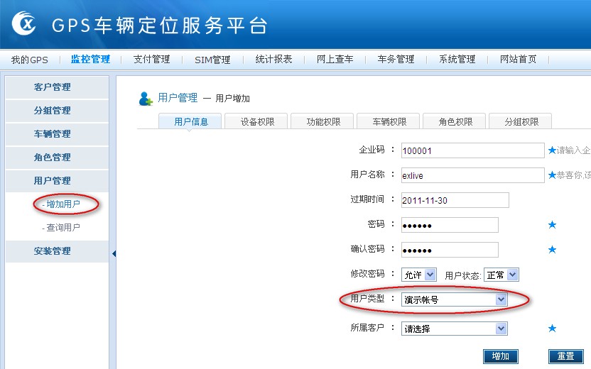 查看后台增加用户时“用户类型”是否选择的是“演示帐号”