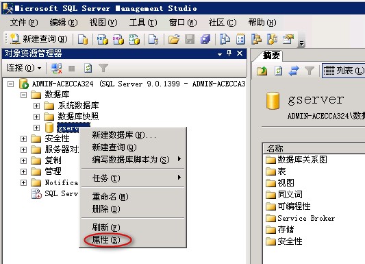 1,? 进入数据库,在gserver上点击右键,选择“属性”,如下图: